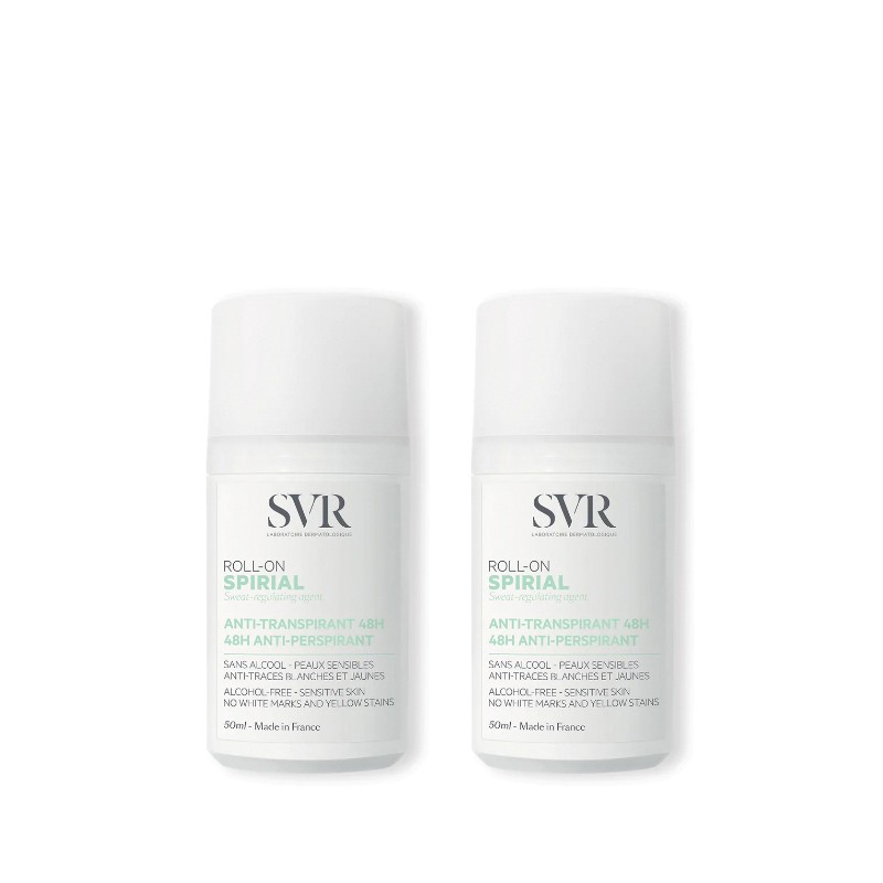 Svr Spirial Roll-On é um desodorizante que regula a transpiração normal a excessiva das axilas. É eficaz durante 48 horas, absorve a humidade e combate os odores desagradáveis. Não deixa marcas, perfeitamente adaptado às peles sensíveis. Textura fresca e fluida com um acabamento seco.