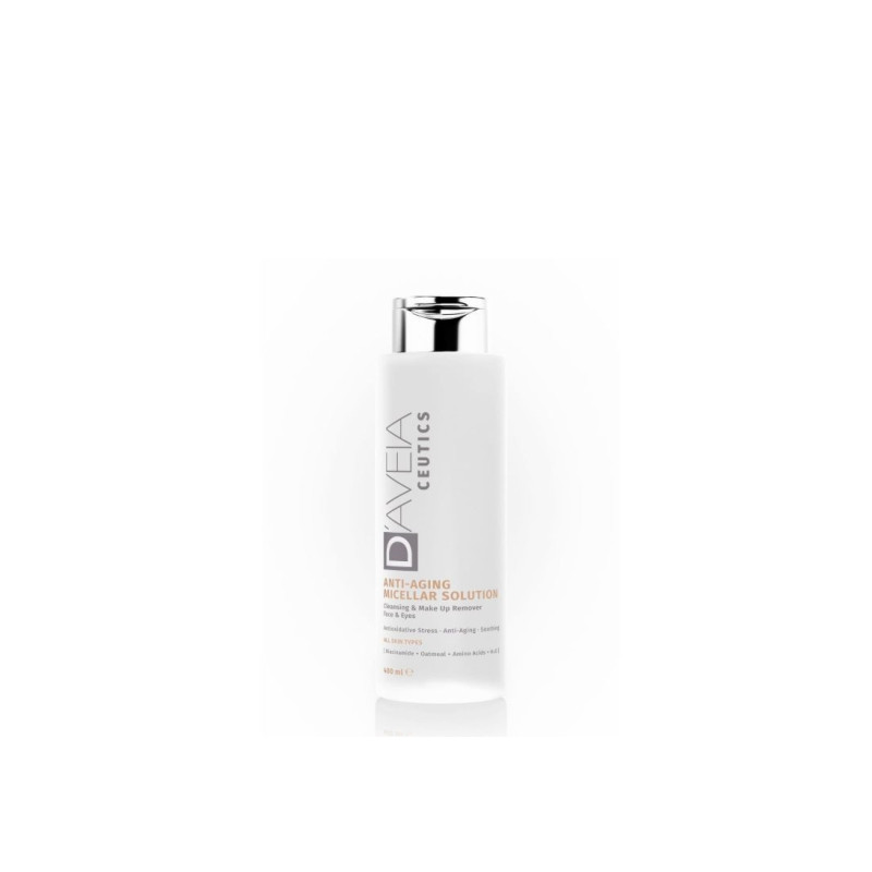 D'Aveia Ceutics Anti-Aging Água Micelar 400ml limpa e desmaquilha fisiologicamente o rosto, olhos e pescoço, respeitando o filme hidrolipídico protetor. Melhora a circulação, ajudando a reduzir a vermelhidão, e hidrata a pele. Ajuda também a melhorar a textura e aparência da pele, ao tonificar e reduzir a dimensão dos poros. Para além disso, ajuda a aclarar e reduzir as manchas da idade. Fornulada com antioxidantes, esta água micelar ajuda a prevenir o envelhecimento e fotoenvelhecimento. Adequada a todos os tipos de pele, incluindo a mais sensível.