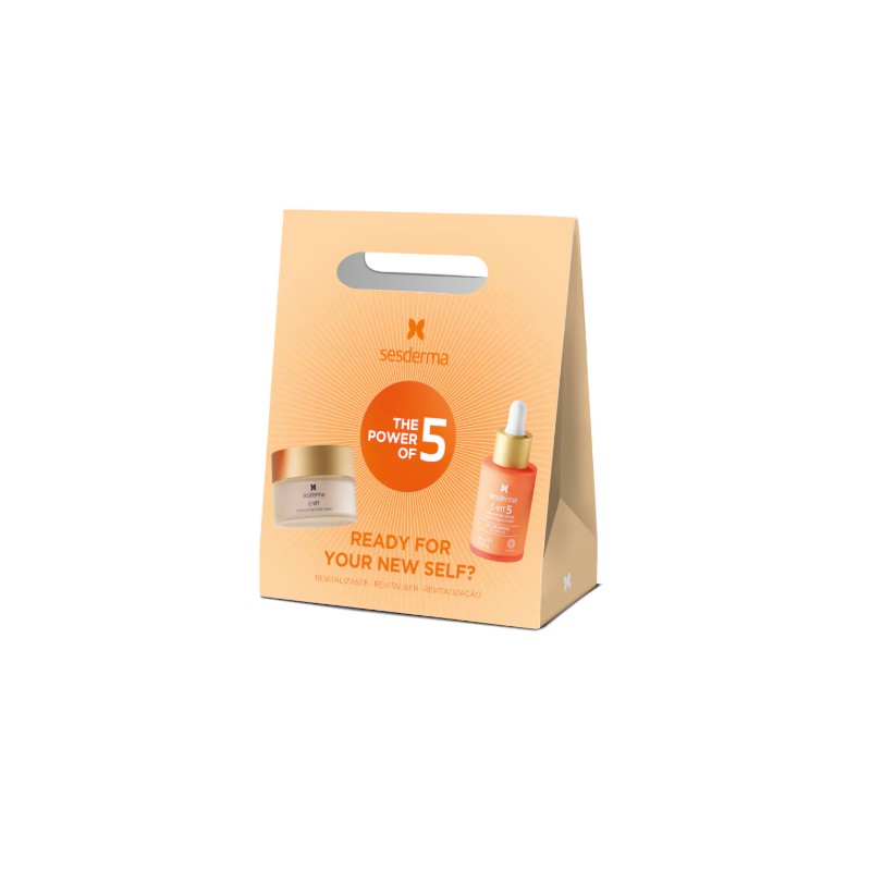 Coffret constituído por dois cuidados Sesderma: Sesderma C-Vit 5 Liposomal Sérum 30ml e Sesderma C-Vit Creme Facial 50ml.