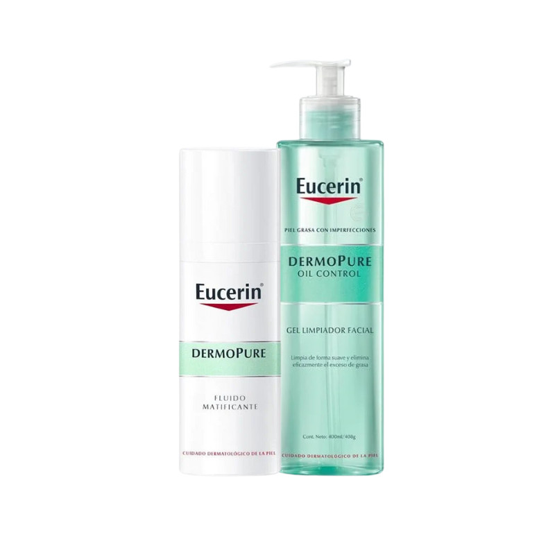 Pack constituído pelos cuidados: Eucerin Dermopure Oil Control Fluido Matificante 50ml e Eucerin Dermopure Gel Limpeza Facial 200ml.