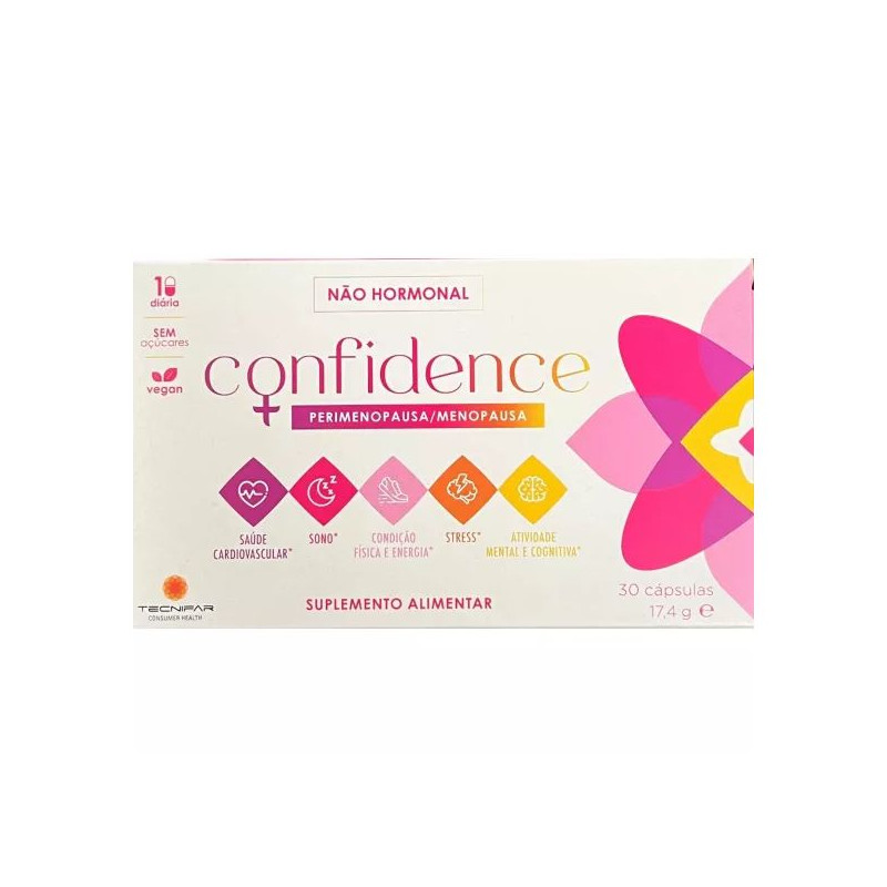 Confidence 30 Cápsulas é um suplemento alimentar com Agripalma, Pólen, Ashwagandha, Bacopa, Raiz de ouro, magnésio, zinco, melatonina, e vitaminas D, B6, B1 e B12. Para a saúde da mulher na menopausa, incluindo saúde cardiovascular, sono, condição física e energia, stress, e atividade mental e cognitiva.