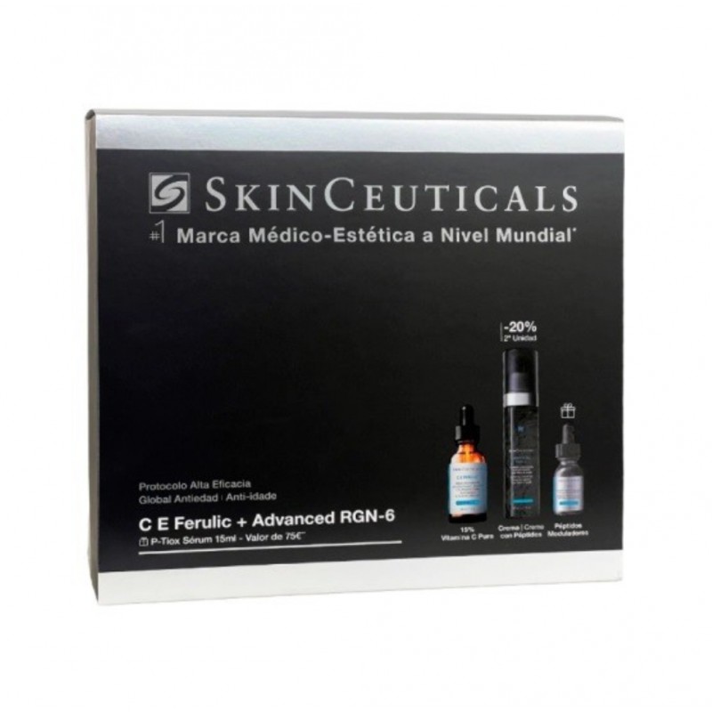 Coffret constituído pelos cuidados Skinceuticals C E Ferulic Sérum 30ml, Skinceuticals Advanced RGN-6 50ml e Skinceuticals P-Tiox 15ml.